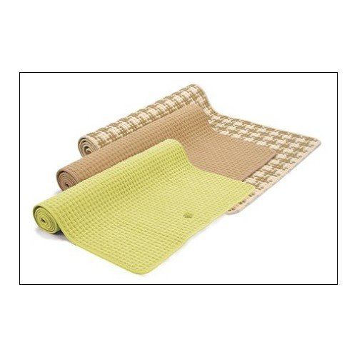 The Solace Mat features a richly woven texture that aids in traction and absorbing perspiration. This is like a woven fabric rug, yet thickly textured. It is not made of plastic like most mats but is a different mat altogether. Maintains its color, beauty and non-skid backing after numerous machine washings. Dimensions are 73" by 29".